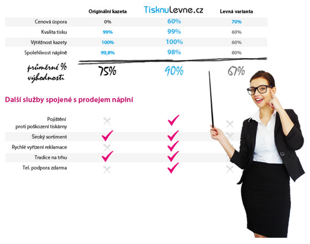 Ušetřit můžete až 60 % v porovnání s originálními náplněmi, přičemž kvalita tisku a výtěžnost náplně je shodná. Navíc, k alternativním náplním značky Tisknulevne.cz získáte pojištění proti poškození tiskárny a telefonickou podporu zdarma.